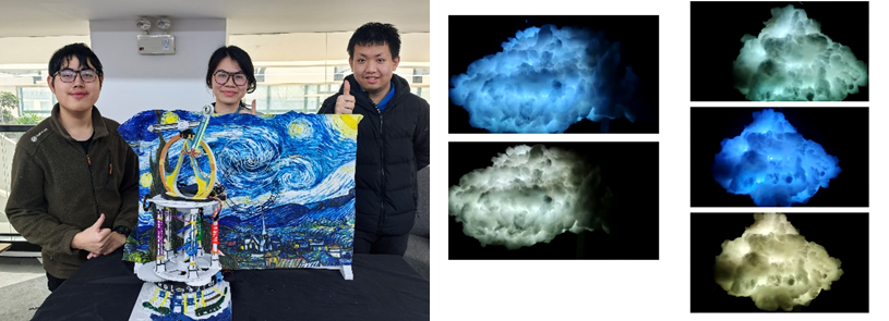 多组作品不仅在形态上追求美感,更在交互体验与技术实现上大胆创新。陈泽隆小组的《星空下的巴别塔》在梵高“星空”的背景下,创造性地构建了多级“混沌摆”结构。团队引入无线信号传输技术,实时捕捉装置的混沌摆动数据并转化为无规律声音,实现了视听通感的艺术转换,探讨了文明中“有序与混乱”的深刻命题。张卜元小组的《天气云》则将硬核科技包裹于柔软形态之中,团队利用棉花与LED光效营造出云朵的质感,通过红外传感与网络天气API联动,呈现出如同“呼吸”般的智能交互效果,其技术实现的完整度获得了评审的高度肯定。