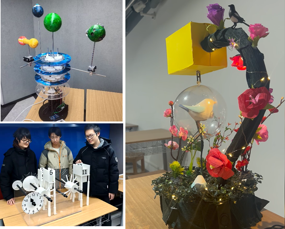 对物理秩序的探索也是本次答辩的一大亮点。杨忠霖小组的《齿轮与引力》受天体运行规律启发,利用激光切割构建了模拟太阳系运行的机械装置,以不同的齿轮比精准诠释了引力场中的永恒秩序 。钟文杰小组的《3D数字时钟》利用“马耳他十字”结构,将抽象的时间流逝转化为直观的机械位移 。此外,吴家宝小组的《鸟欲花香》与王子涵小组的《晴天娃娃》分别通过磁力驱动与光电结合,展现了生命律动与科技温情的独特视角。